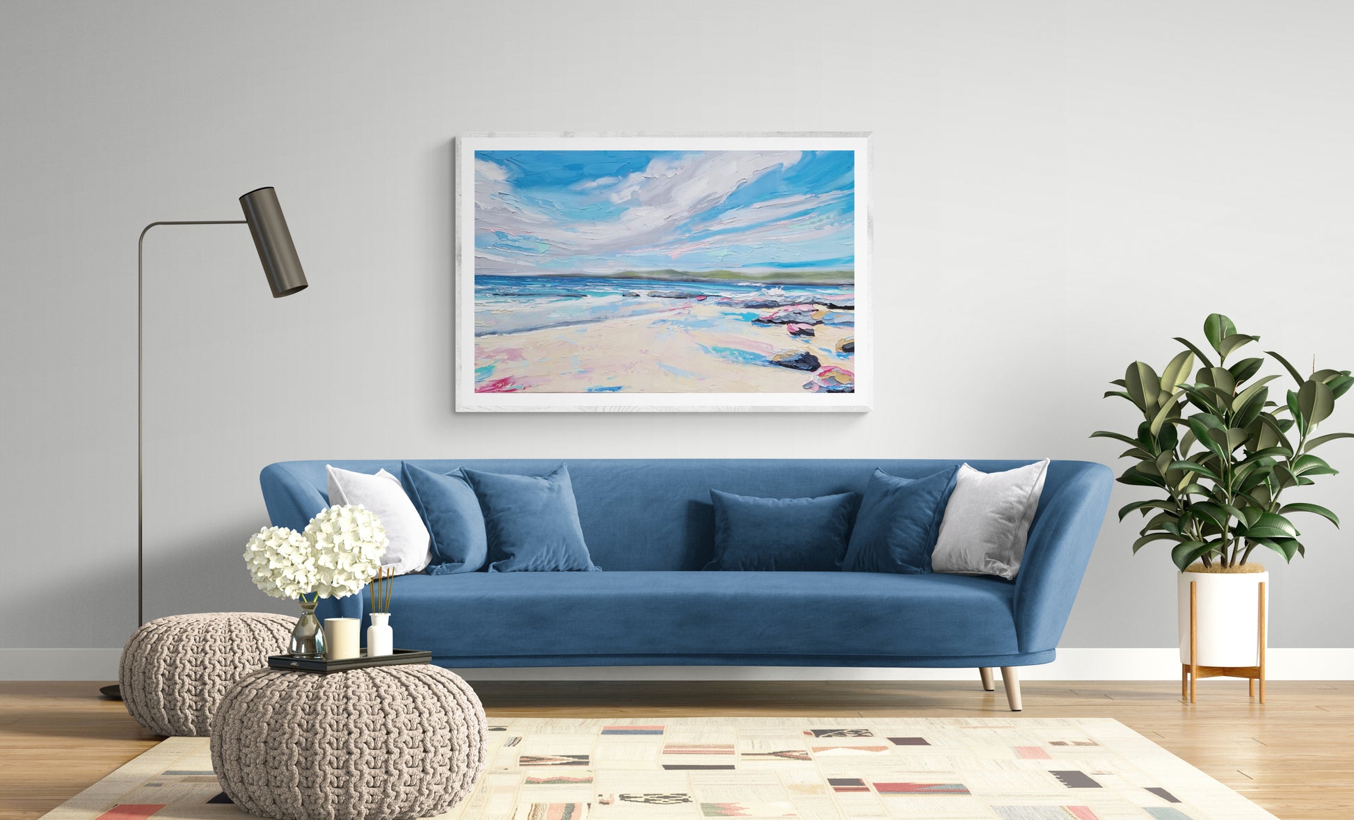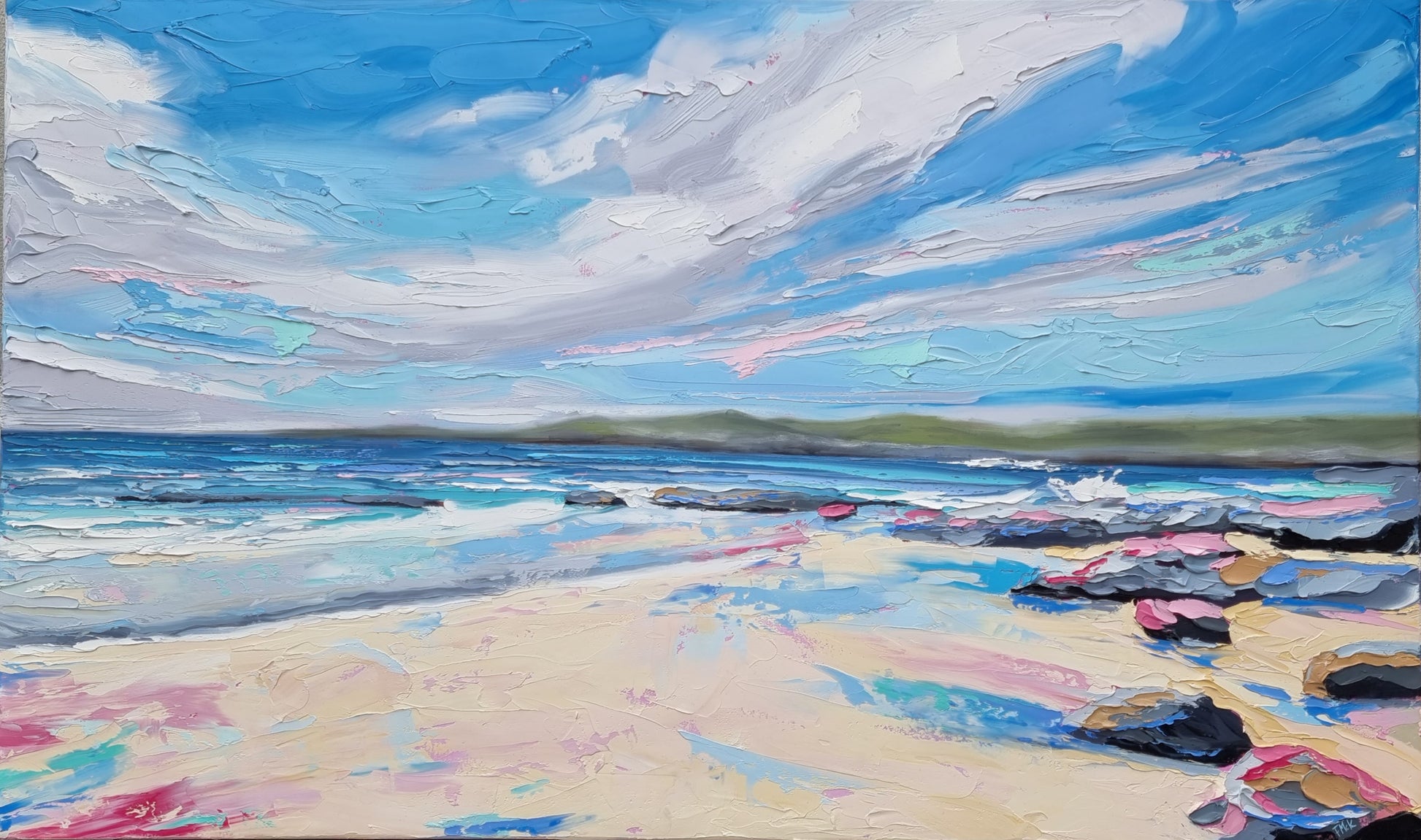 An original oil painting capturing the sense of space and freedom found on this beach in Connemara. The painting evokes images of walking along an expanse of beach while listening to the waves lap up onto the sand. Quiet moments spent by the sea are good for the soul - they allow us to reflect on memories while appreciating the present moment. A calming painting full of hope and peacefulness.