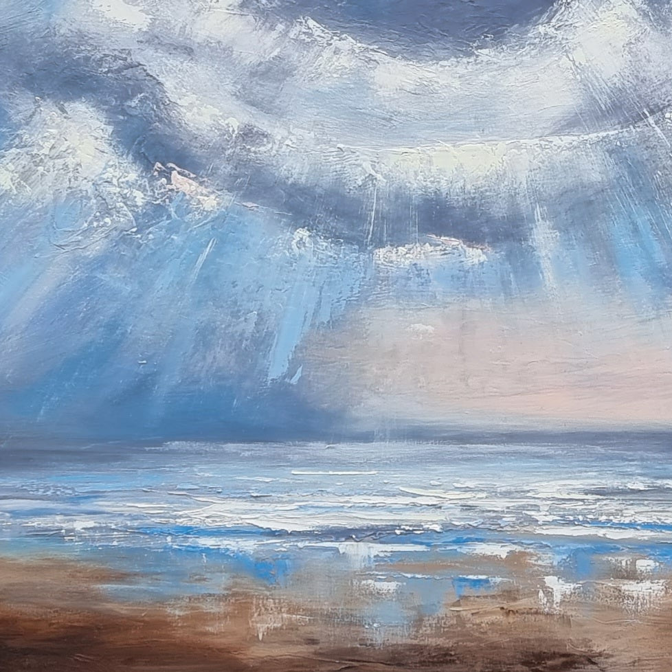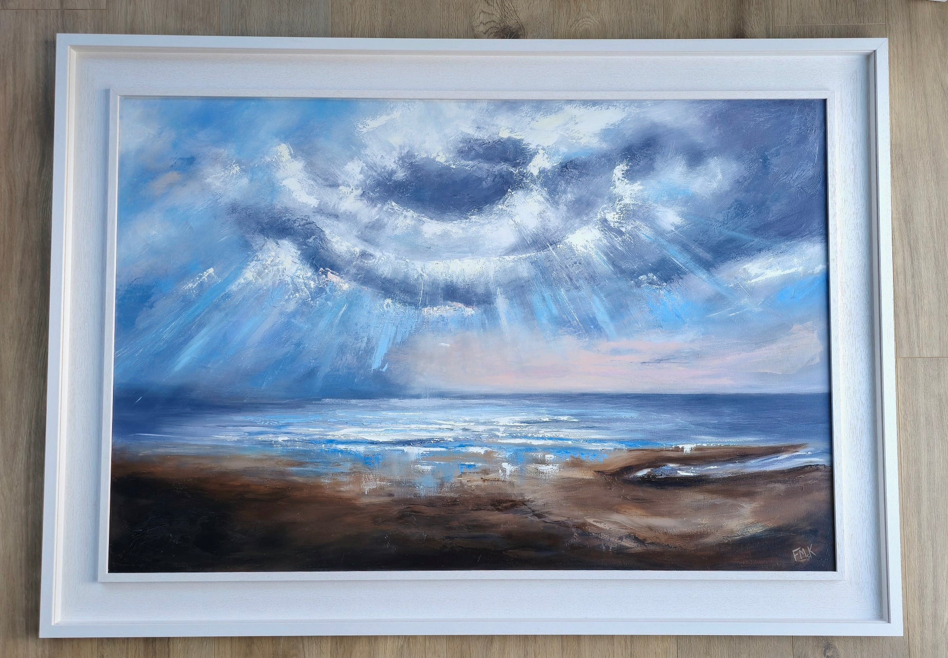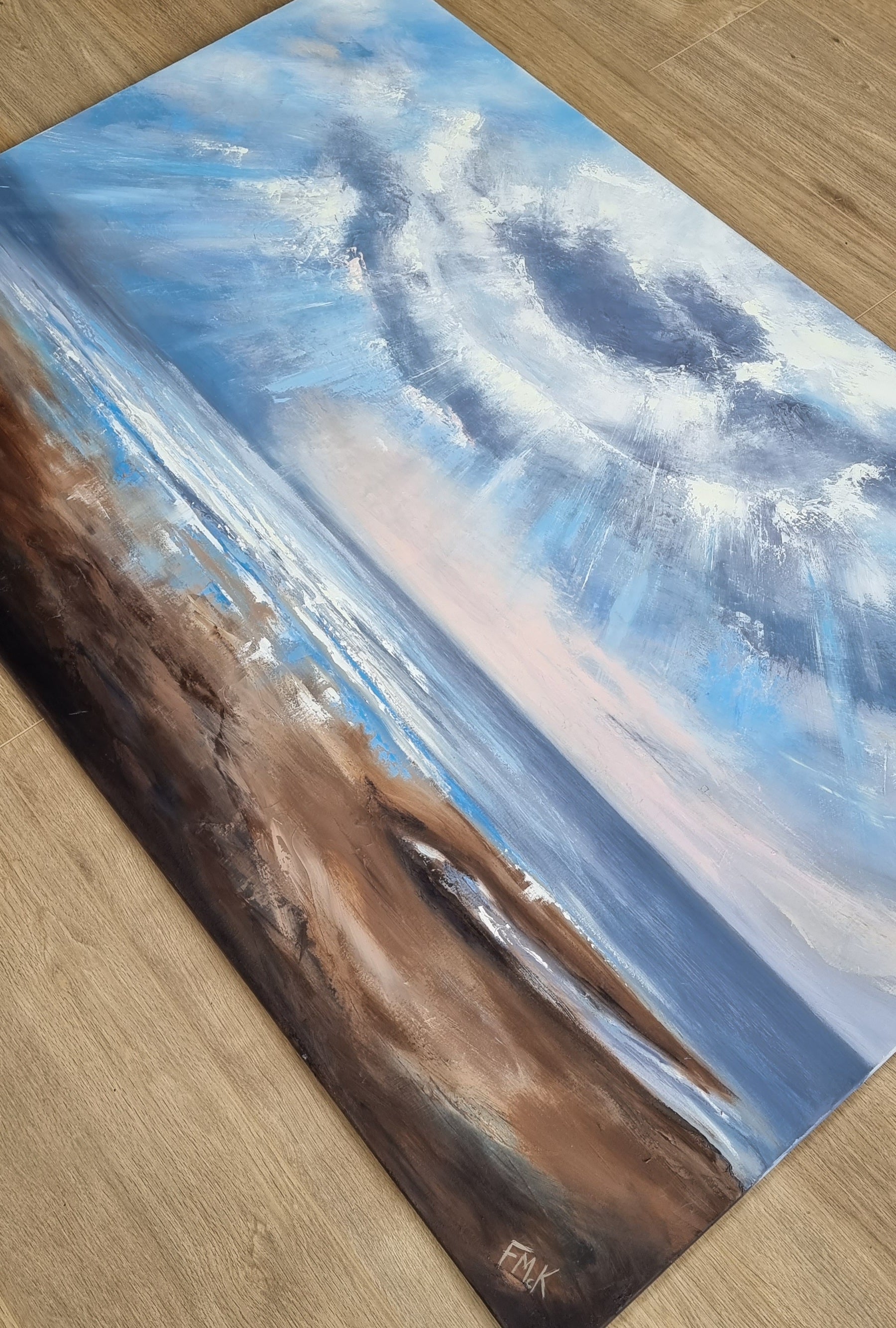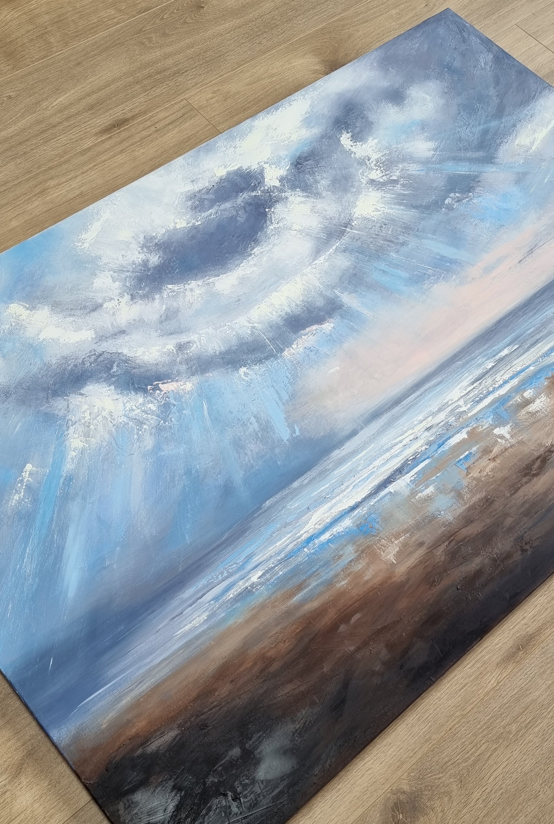This is a large original oil painting with the most spectacular sky above - the light glitters and sparkles down onto the water below. This painting encapsulates the beach as a place to reconnect with the serene beauty of the sea. You can almost feel the cool breeze brushing against your skin, hear the soothing sound of crashing waves, and taste the saltiness of the sea air on your lips.