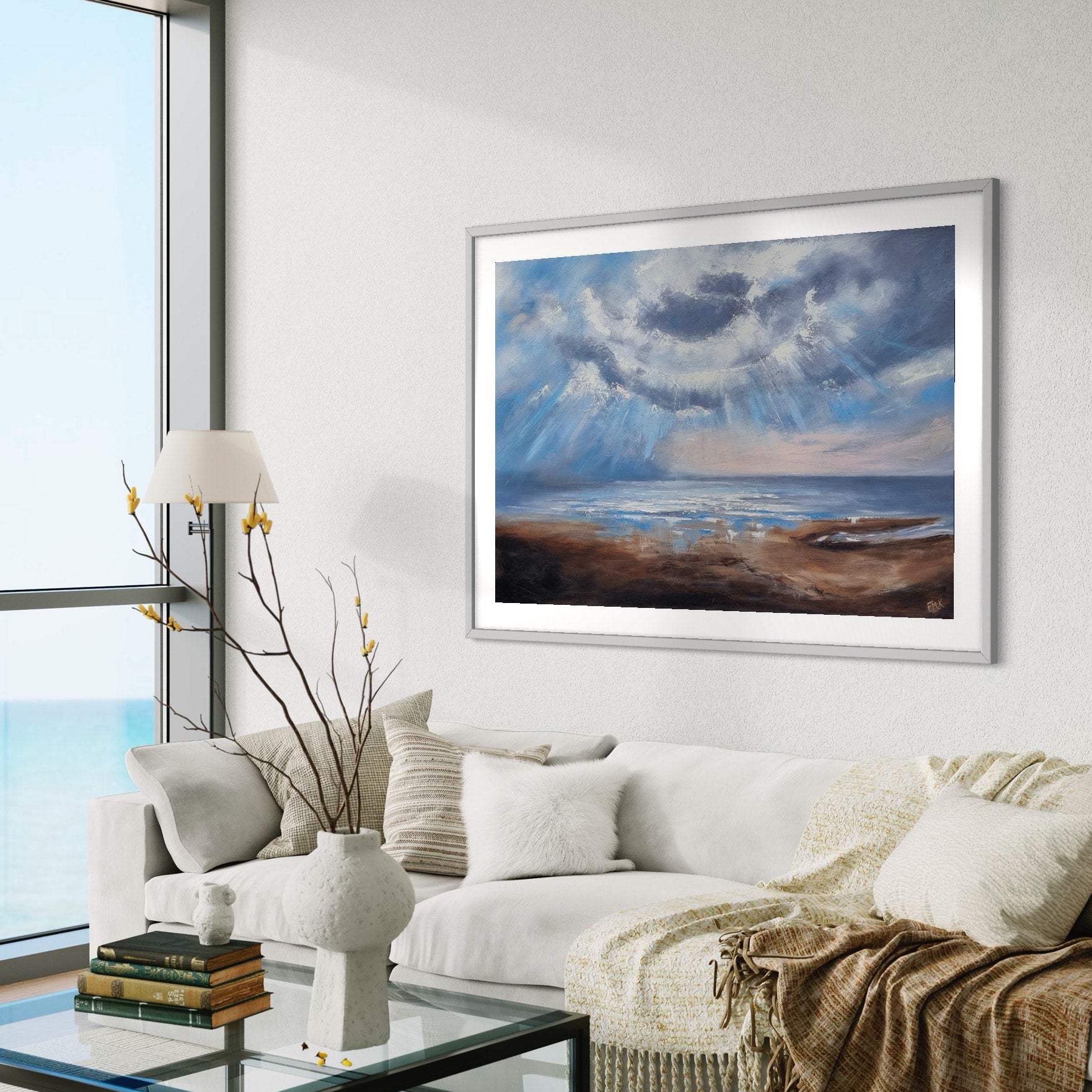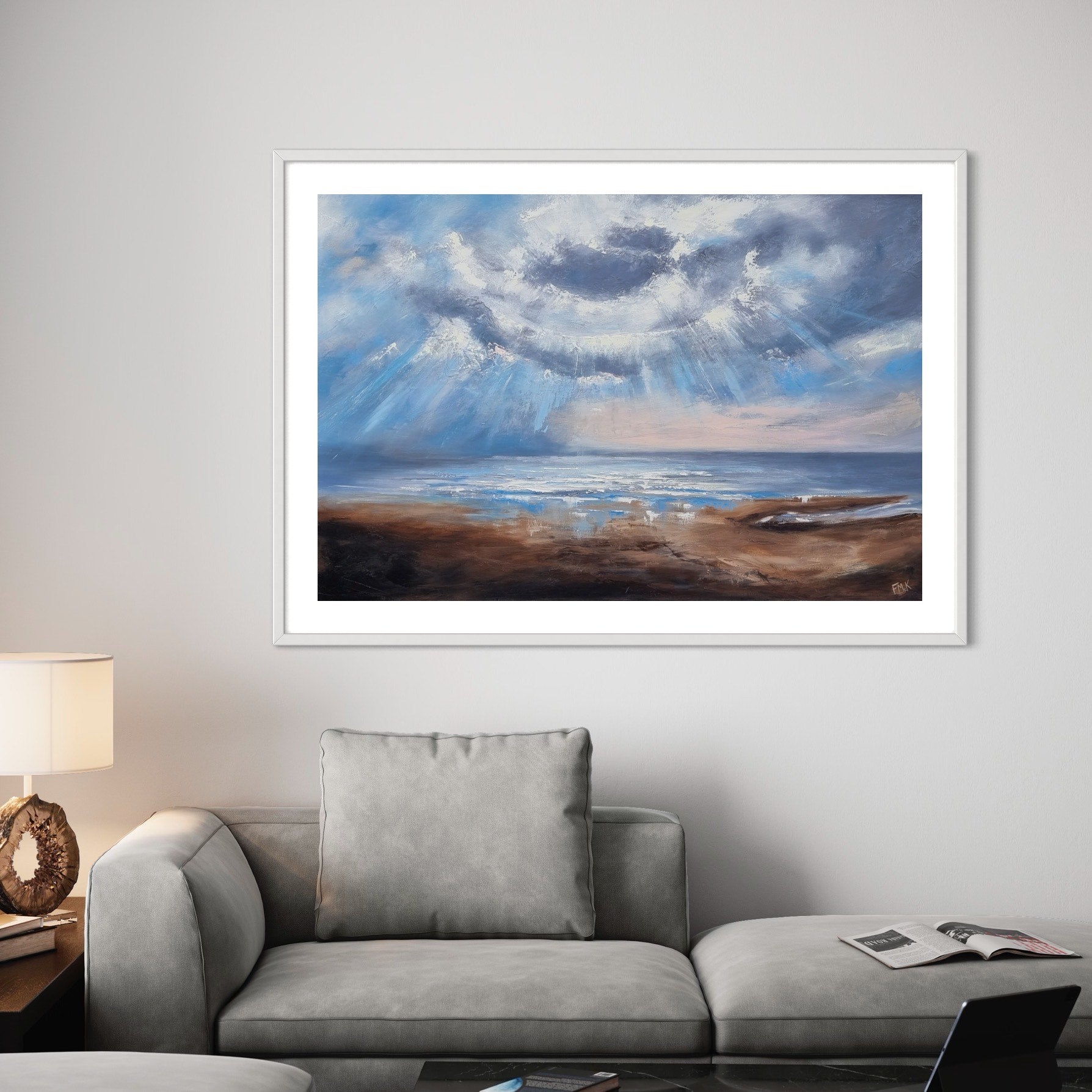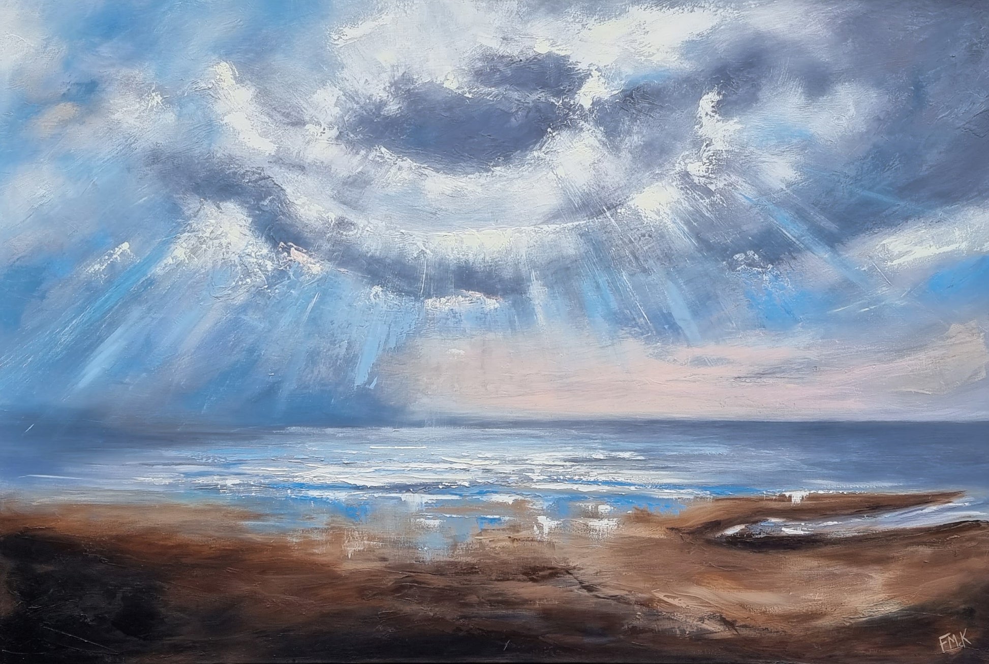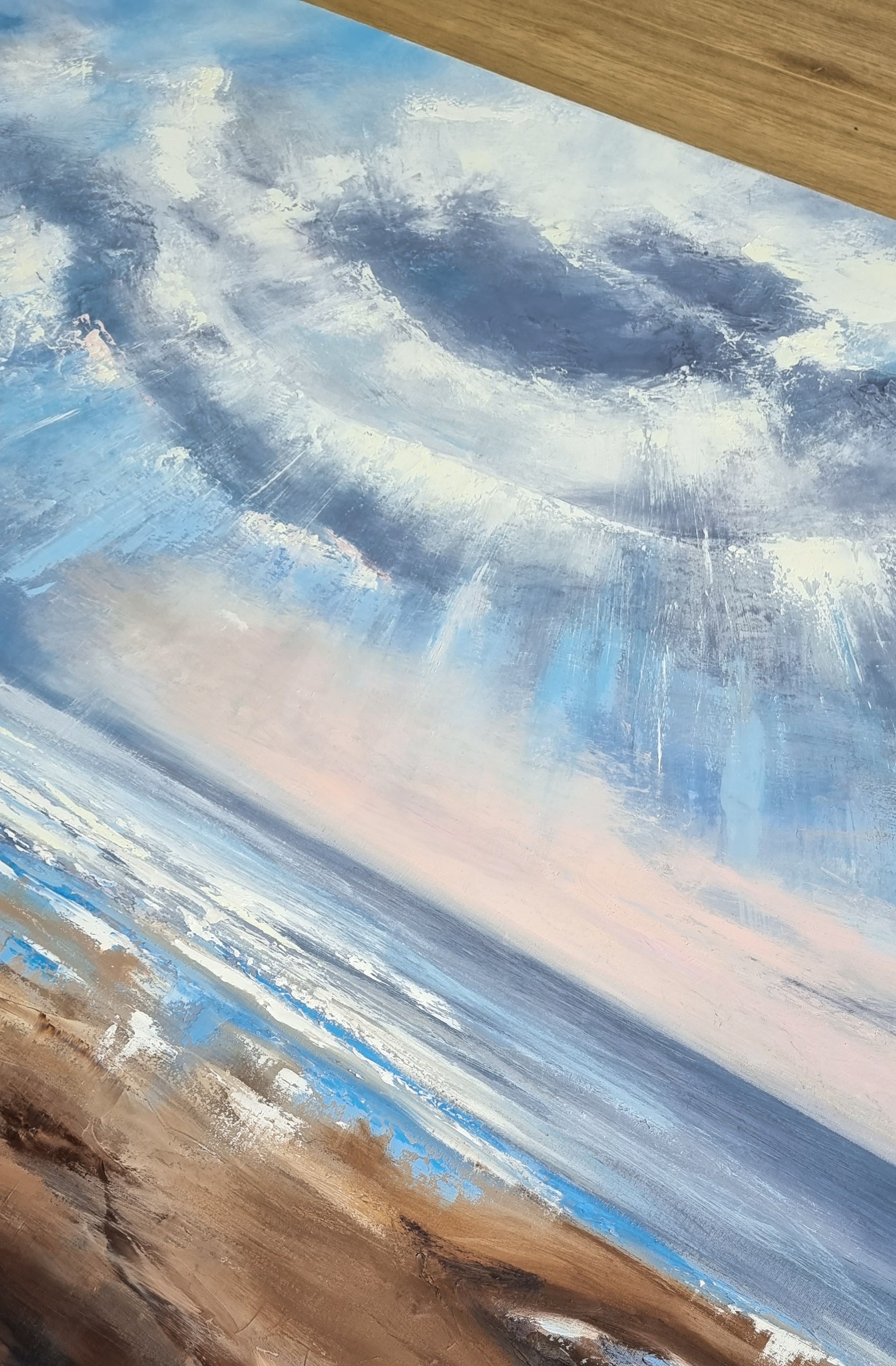 This is a large original oil painting with the most spectacular sky above - the light glitters and sparkles down onto the water below. This painting encapsulates the beach as a place to reconnect with the serene beauty of the sea. You can almost feel the cool breeze brushing against your skin, hear the soothing sound of crashing waves, and taste the saltiness of the sea air on your lips.