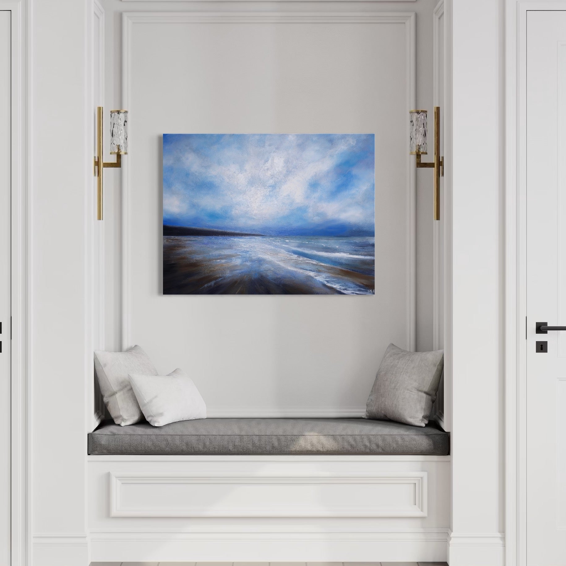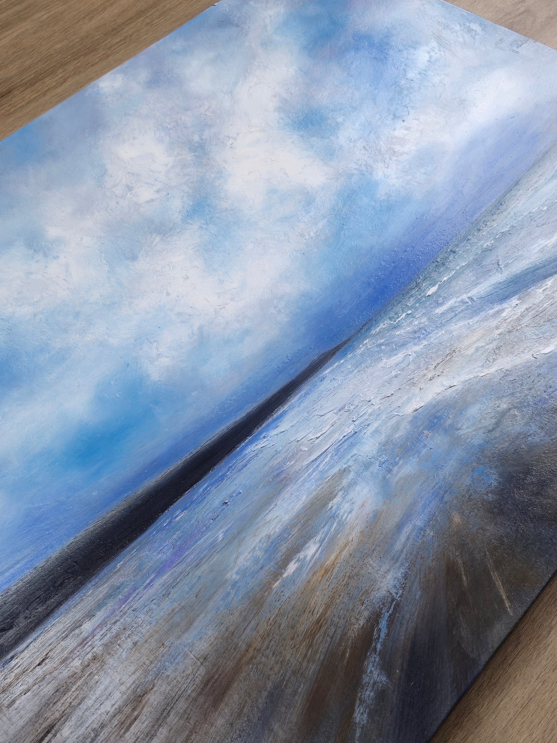 Coastal Calm is a serene seascape that captures the essence of the coast. With layers of soft blues and a gently clouded sky, this piece evokes the tranquil beauty of a calm day by the sea. Its peaceful atmosphere and subtle movement of the horizon invite the viewer to pause, breathe, and immerse themselves in the quiet rhythm of nature. Perfect for bringing a sense of calm into any space.