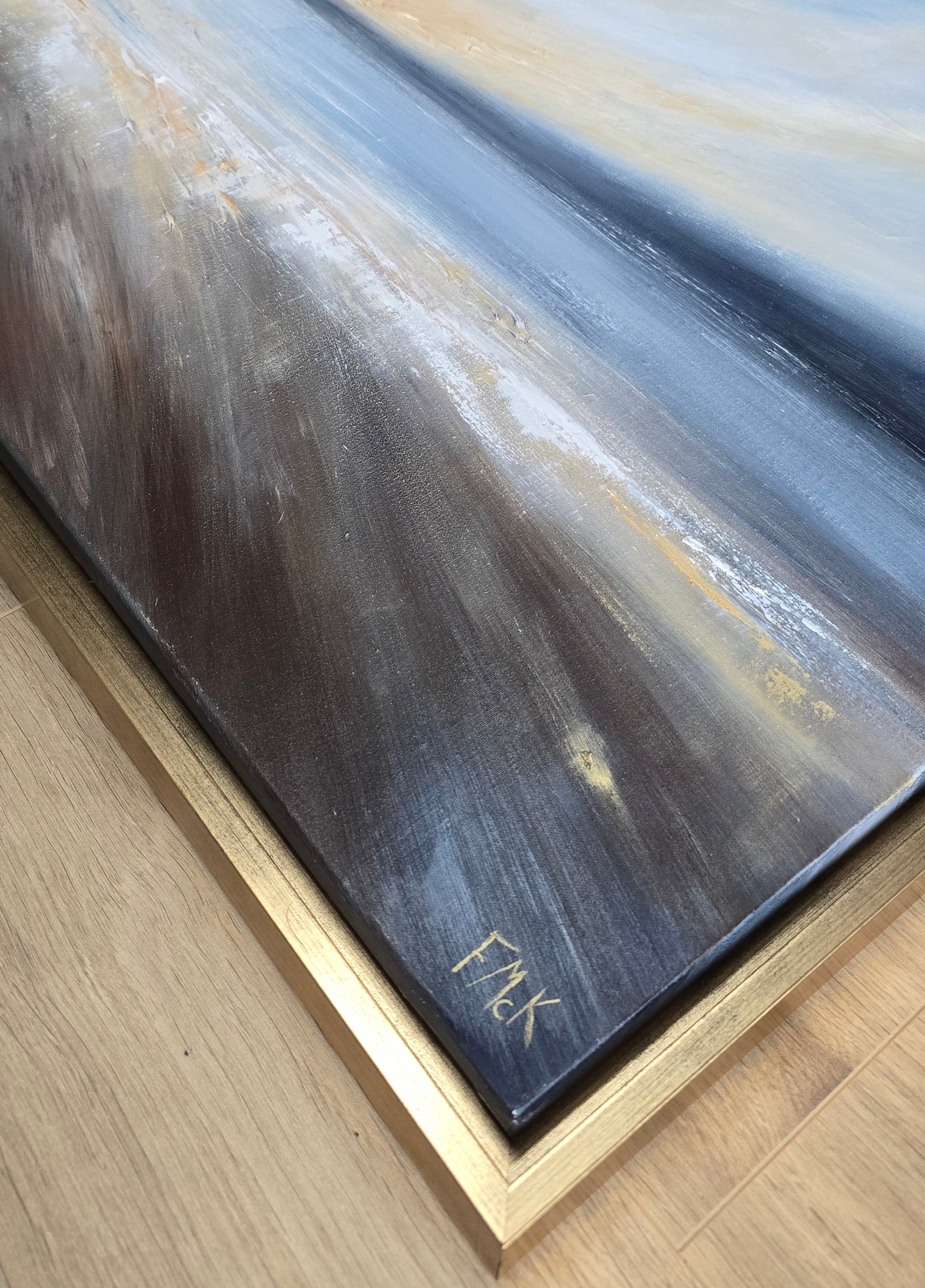 Coastal Glow captures the meeting of light and sea - a moment of stillness where the horizon glows with golden sunset colours. Framed in antique gold, this large piece makes a serene yet striking focal point for any space.