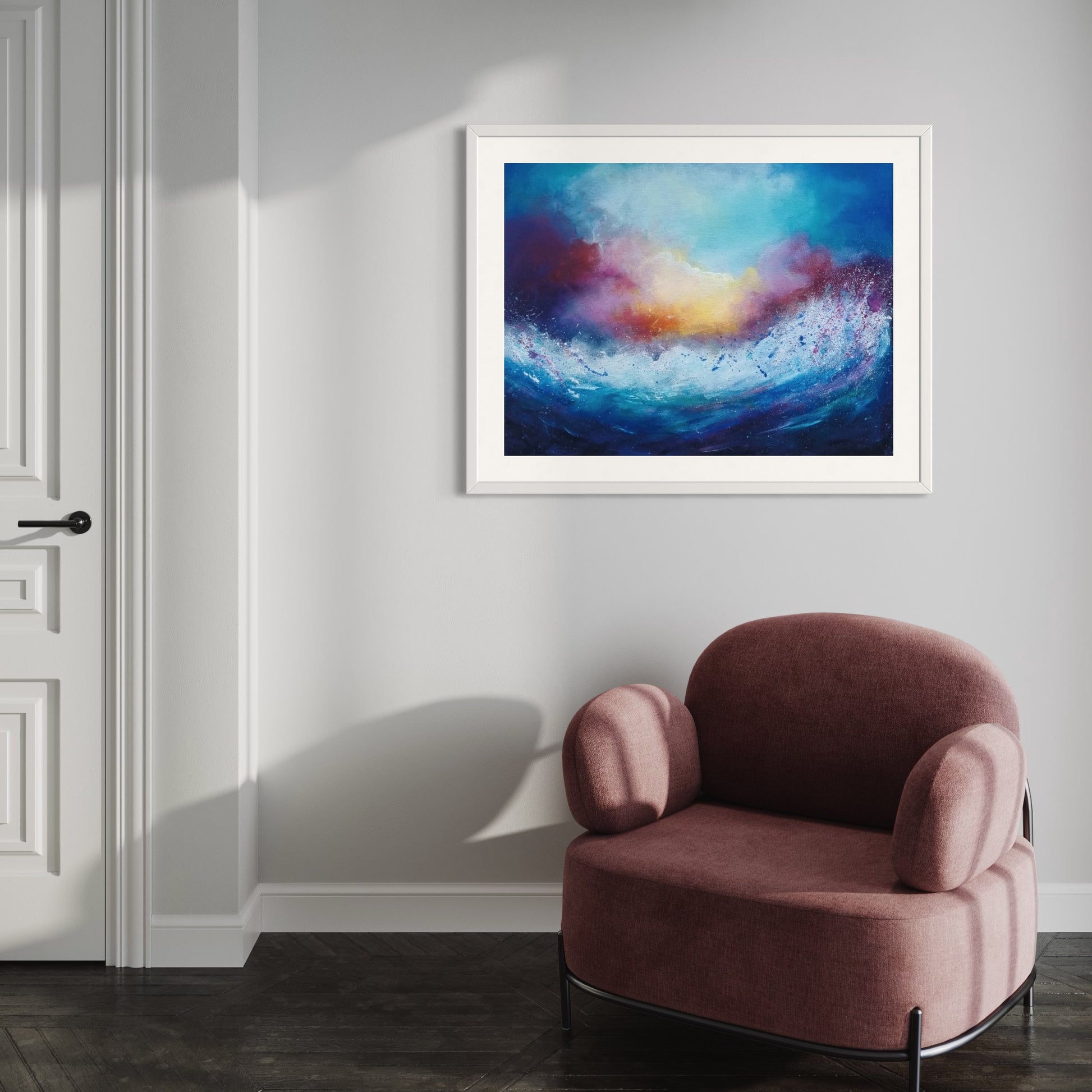 'Colours Borrowed from the Sea' captures the energy of waves crashing and the timeless beauty of a sunset. The expansive skies that stretch above and the waves that crash against the shore are full of inspiration. This print is perfect for those who are drawn to uplifting colours and love spending time by the sea - the rich colours express feelings of positivity and joy.