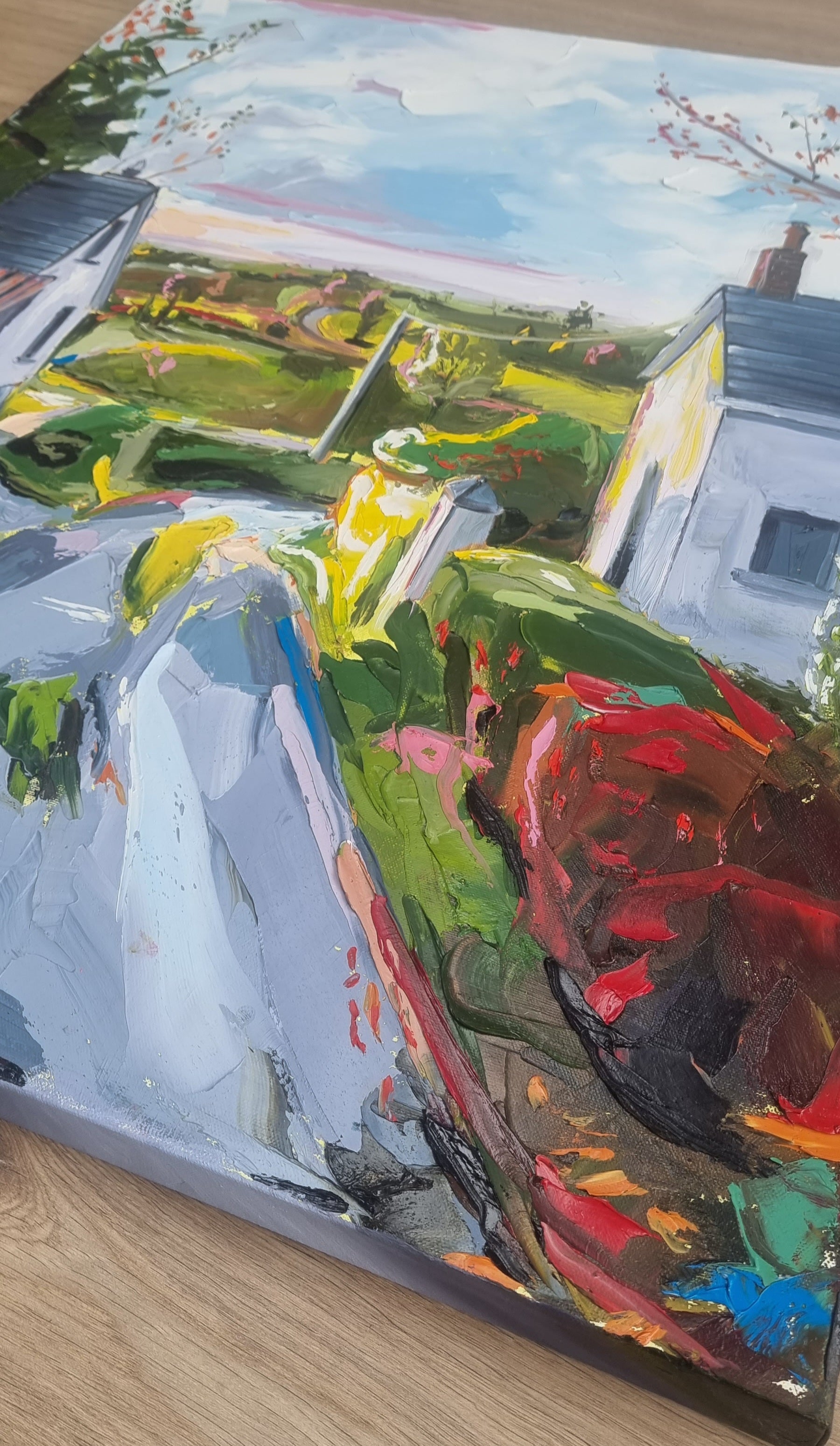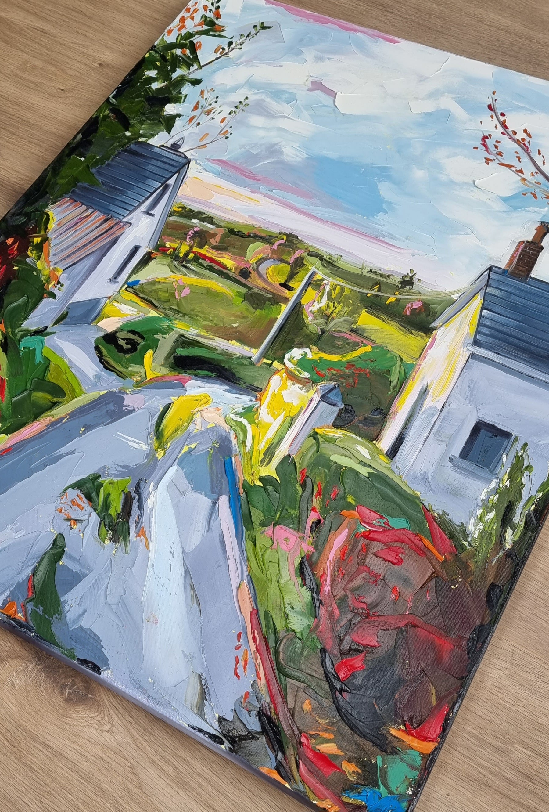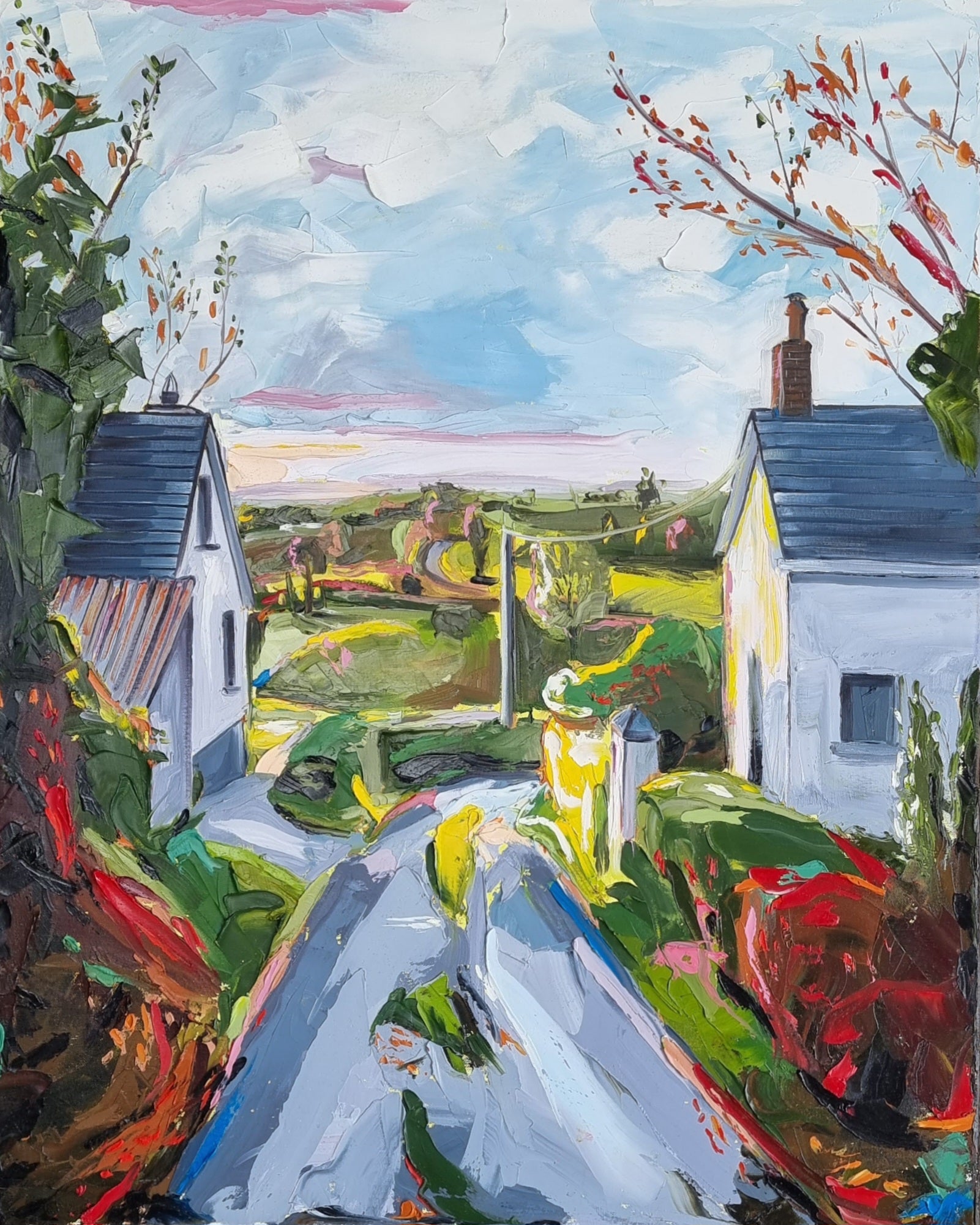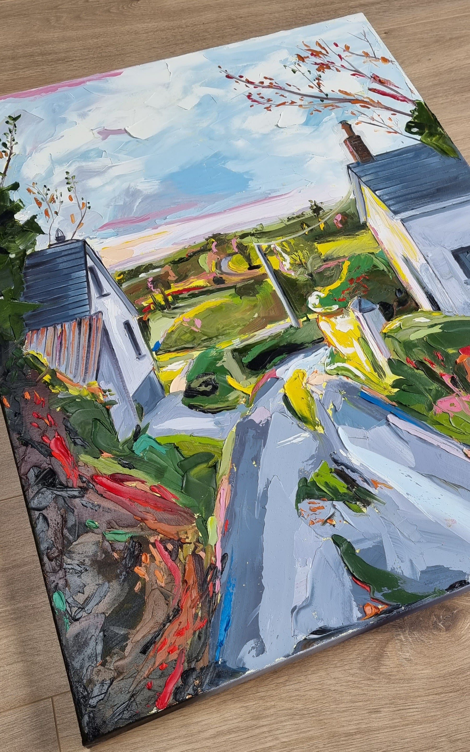 'I'll Meet You Down the Lane' evokes a feeling of nostalgia and an appreciation of the simplicity and beauty of rural life in Ireland. The thick oil paint aims to bring the canvas, and image, to life. The painting invites reflection and suggests a sense of deep connection with the land. Moments in nature offer a sanctuary from the whirlwind of daily life, providing a serene escape into tranquillity. The gentle rustle of leaves in the wind, looking out towards the vast expanse of an open field and walking beneath an open sky.