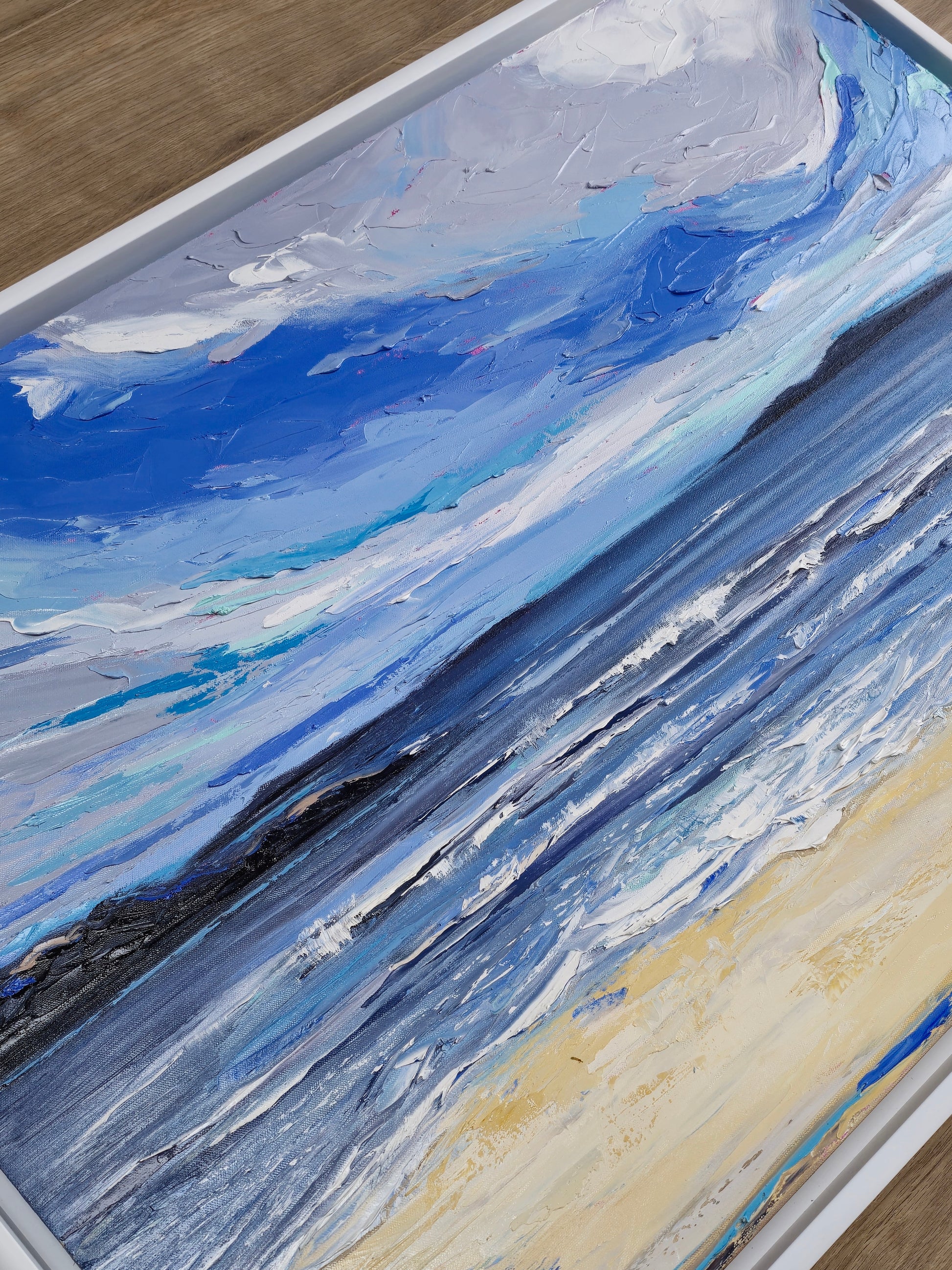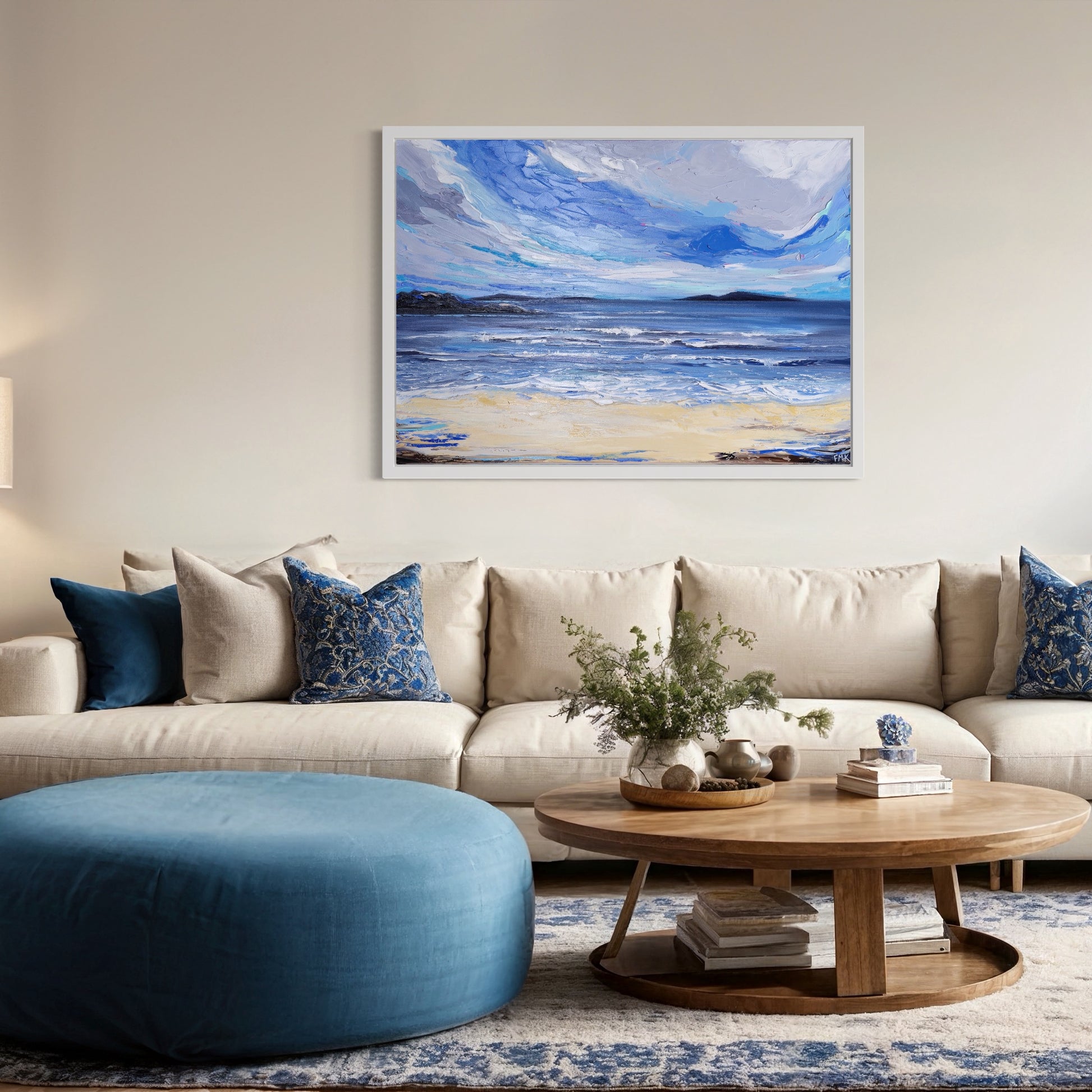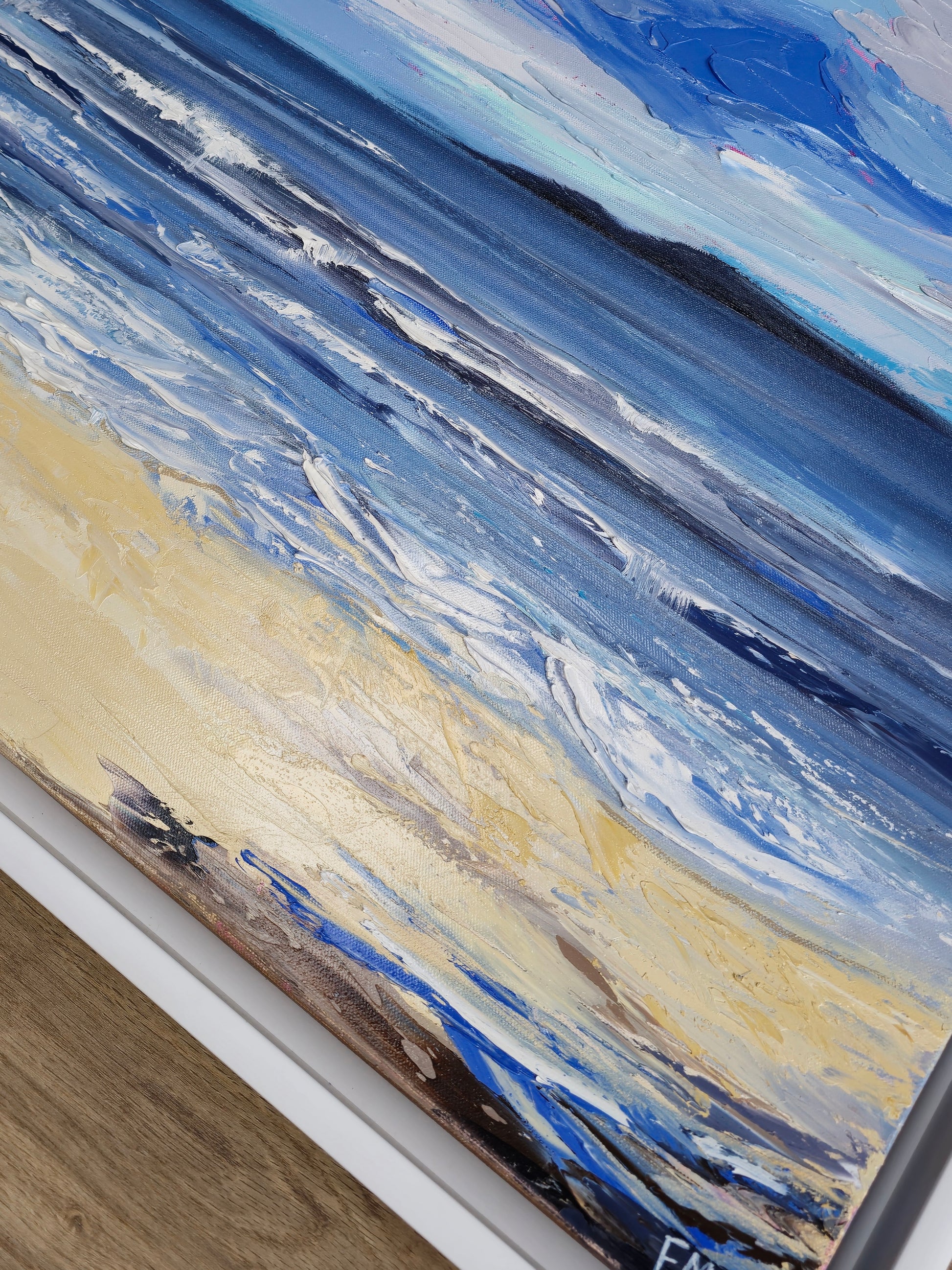 Inspired by the Connemara coast, 'Ocean Breeze' captures the beauty of listening to waves gently roll onto the shore while breathing in the fresh, invigorating sea air. The movement and tranquility of the ocean creates a sense of escape and renewal. Perfect for bringing a touch of coastal calm into any space, this piece invites you to pause, breathe, and feel the restorative energy of the sea.