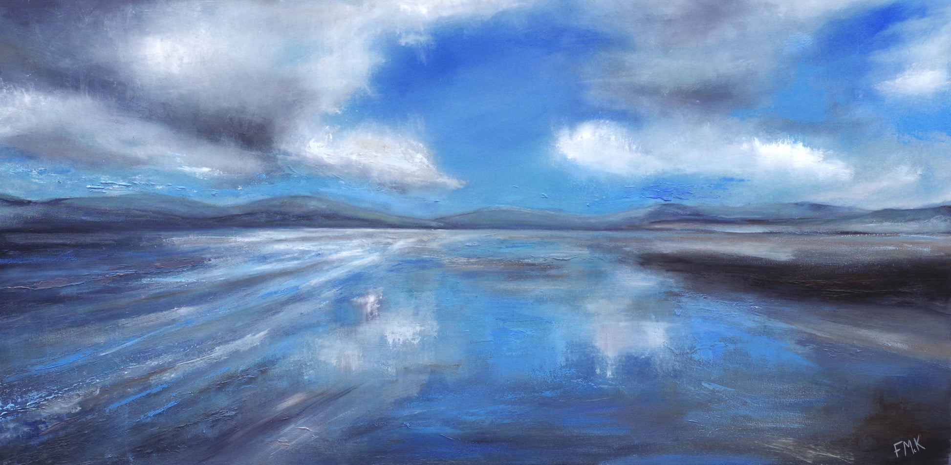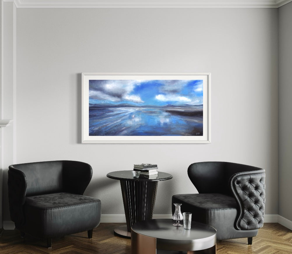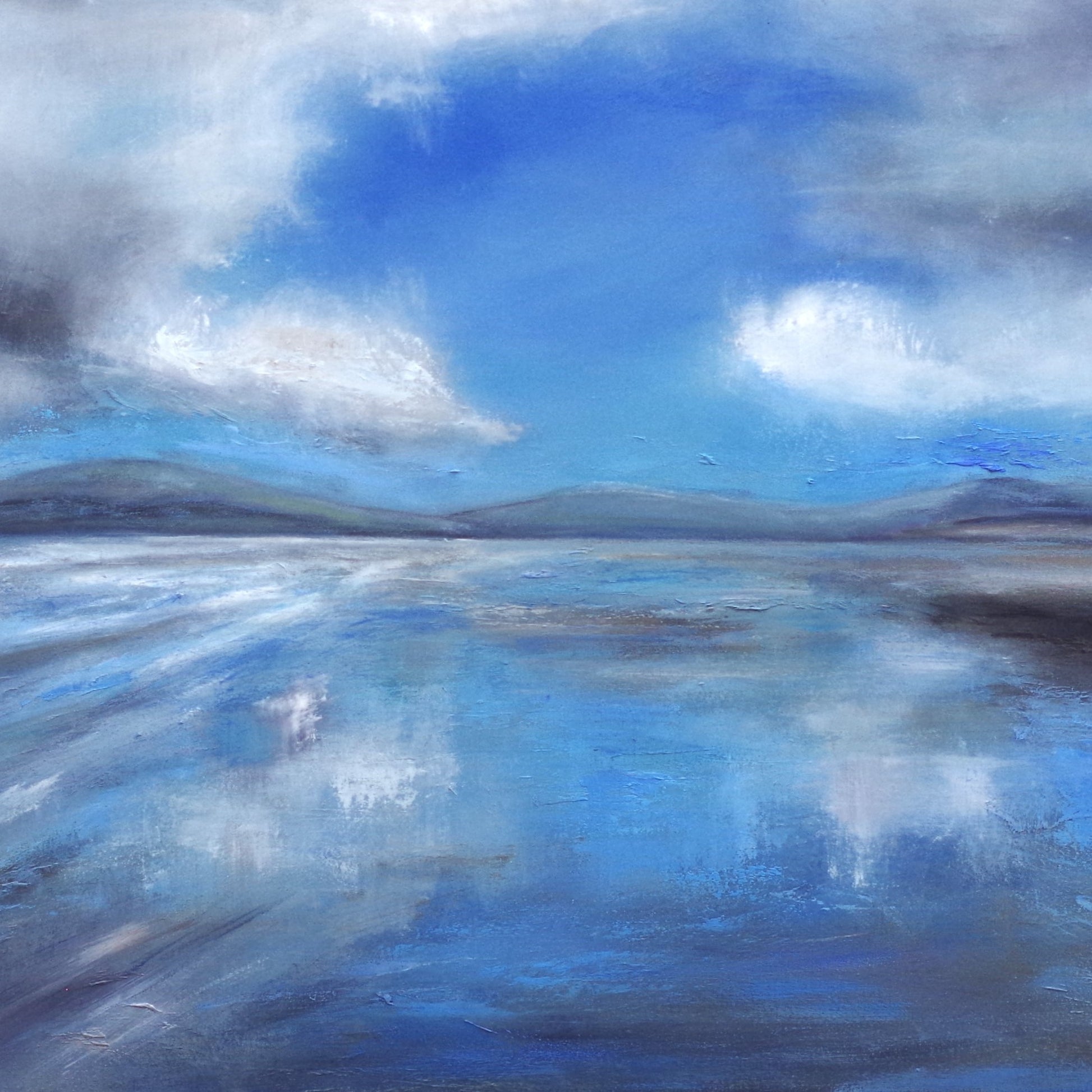 This original oil painting captures the serene beauty of the Irish coast. The tranquil blues of the sea and sky are reflected in the sand, drawing the viewer into a moment of peaceful reflection. The painting evokes a sense of tranquility and serenity. 'Peaceful Reflections' celebrates the connection between the sea, sky and sand, capturing a moment of calm and reflection while walking along the beach.