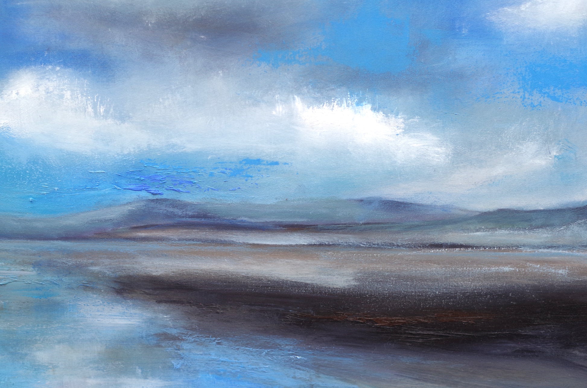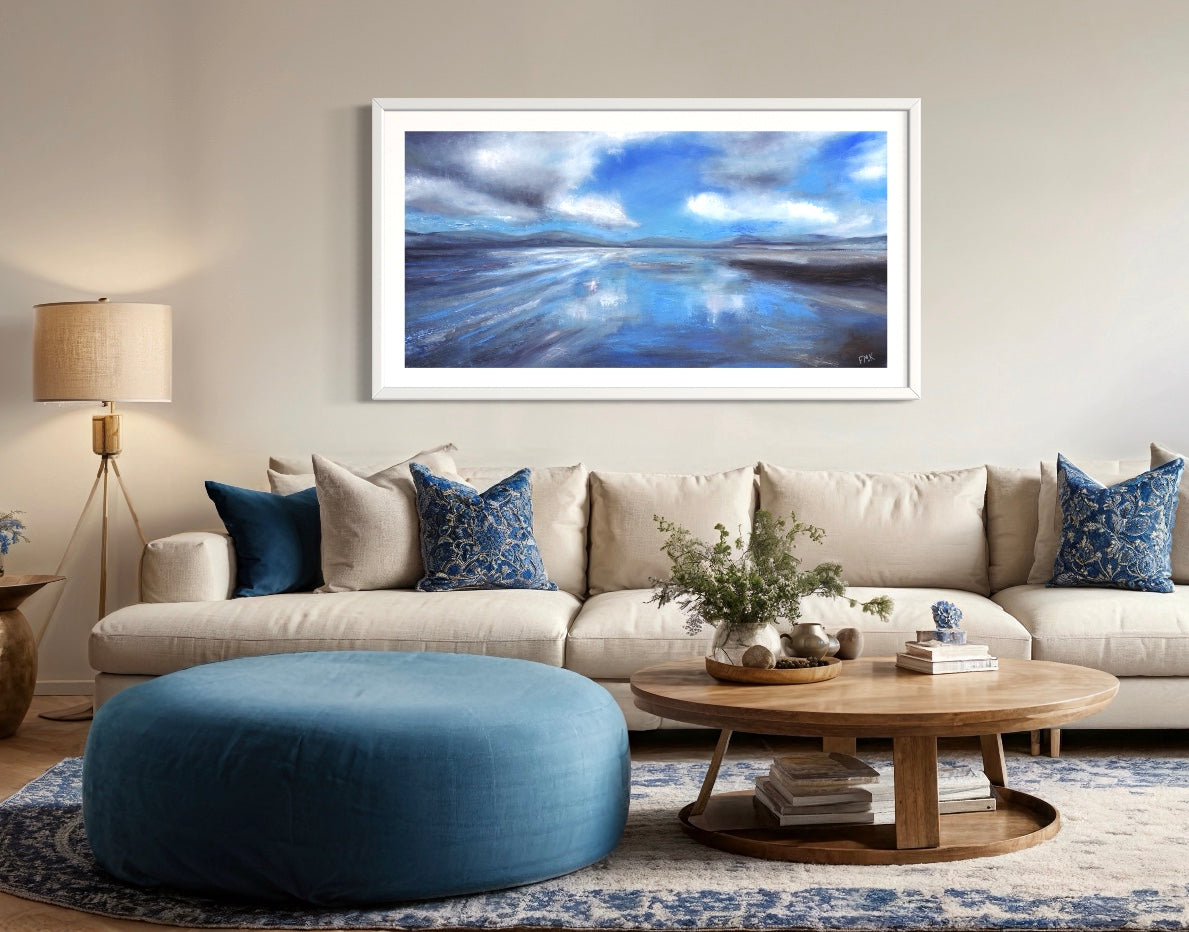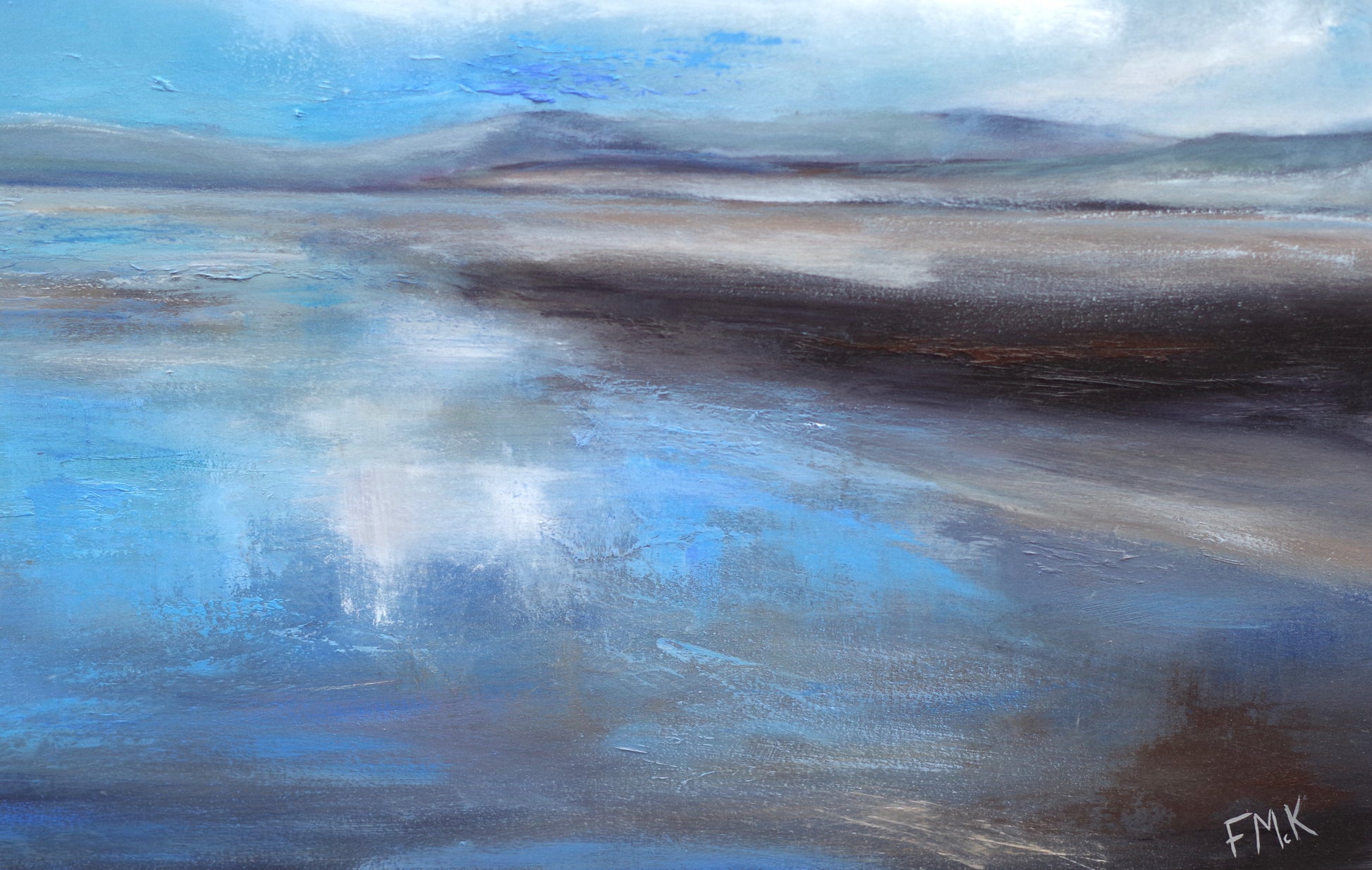 This original oil painting captures the serene beauty of the Irish coast. The tranquil blues of the sea and sky are reflected in the sand, drawing the viewer into a moment of peaceful reflection. The painting evokes a sense of tranquility and serenity. 'Peaceful Reflections' celebrates the connection between the sea, sky and sand, capturing a moment of calm and reflection while walking along the beach.