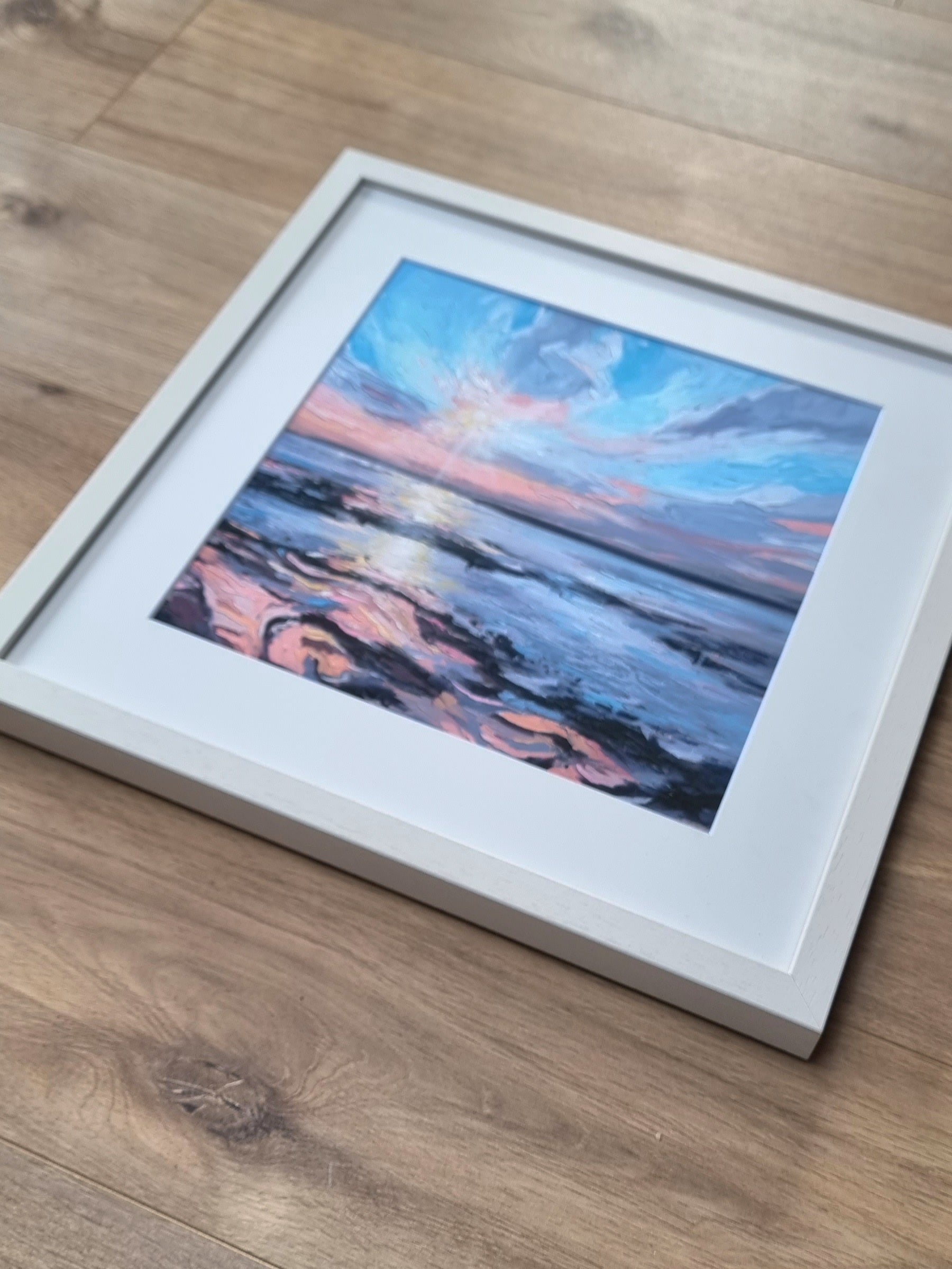 'Promise of a New Dawn' is greatly inspired by the magnificent coastal landscapes along the Wild Atlantic Way. This painting seeks to encapsulate the beauty of a sunset along the Irish coast. The dusty pink tones in the sky mirror the transition from daylight to the approaching twilight, capturing a moment of calm. This sunset painting is perfect for those who love the freedom of being by the coast and appreciate quiet moments in nature.