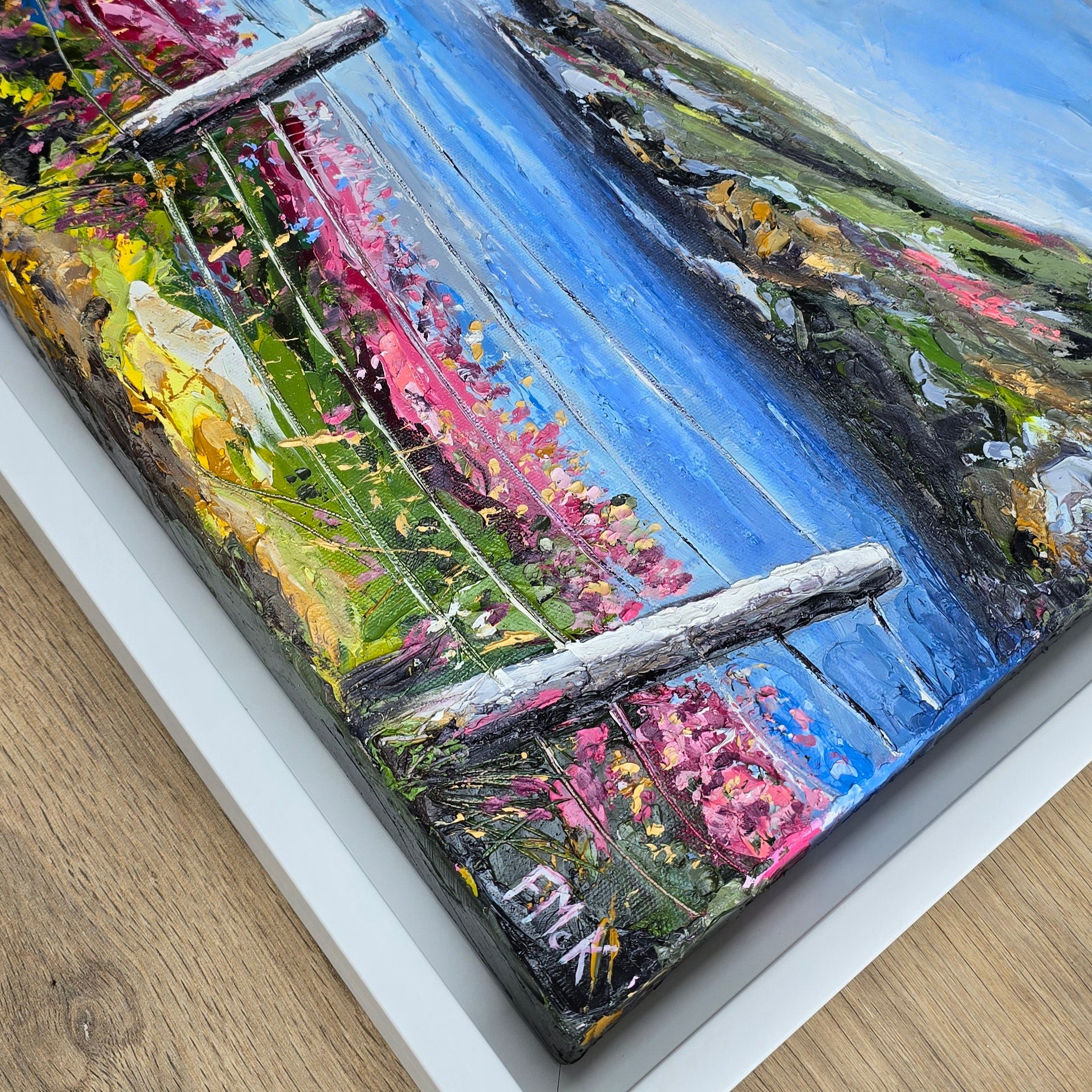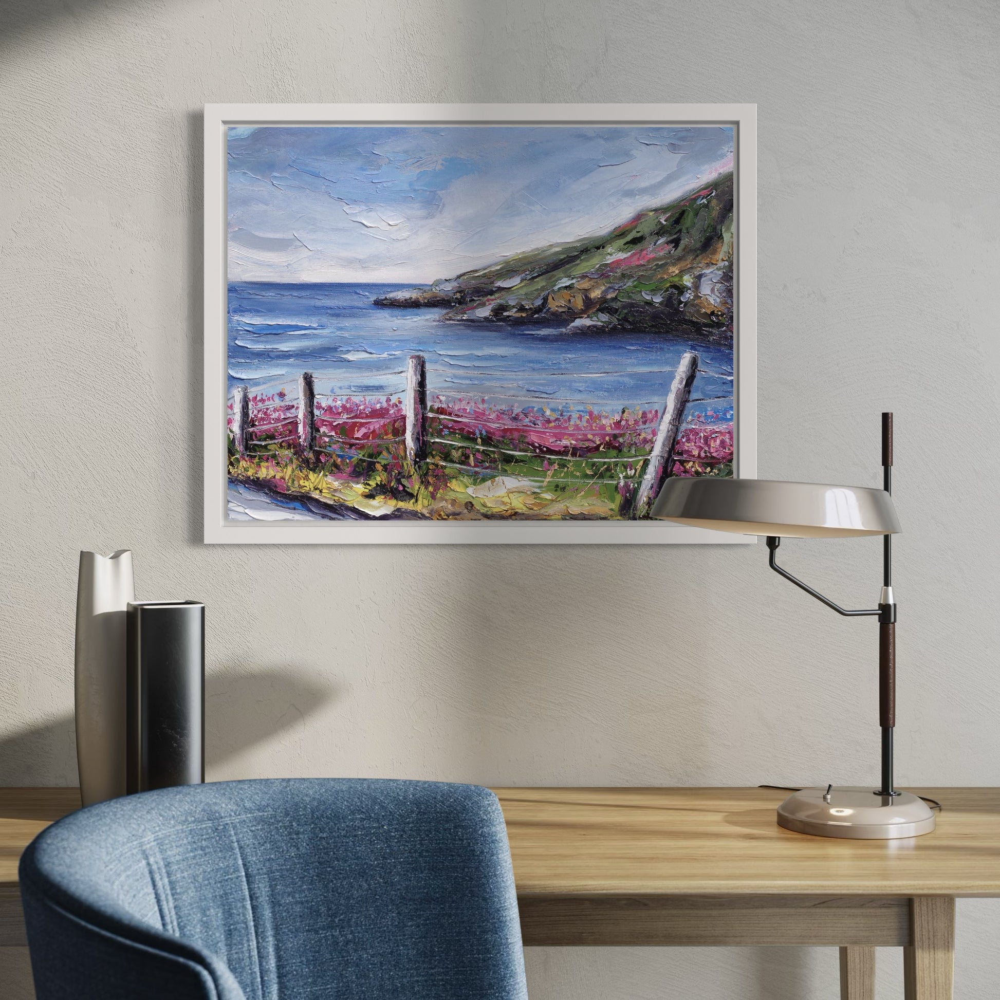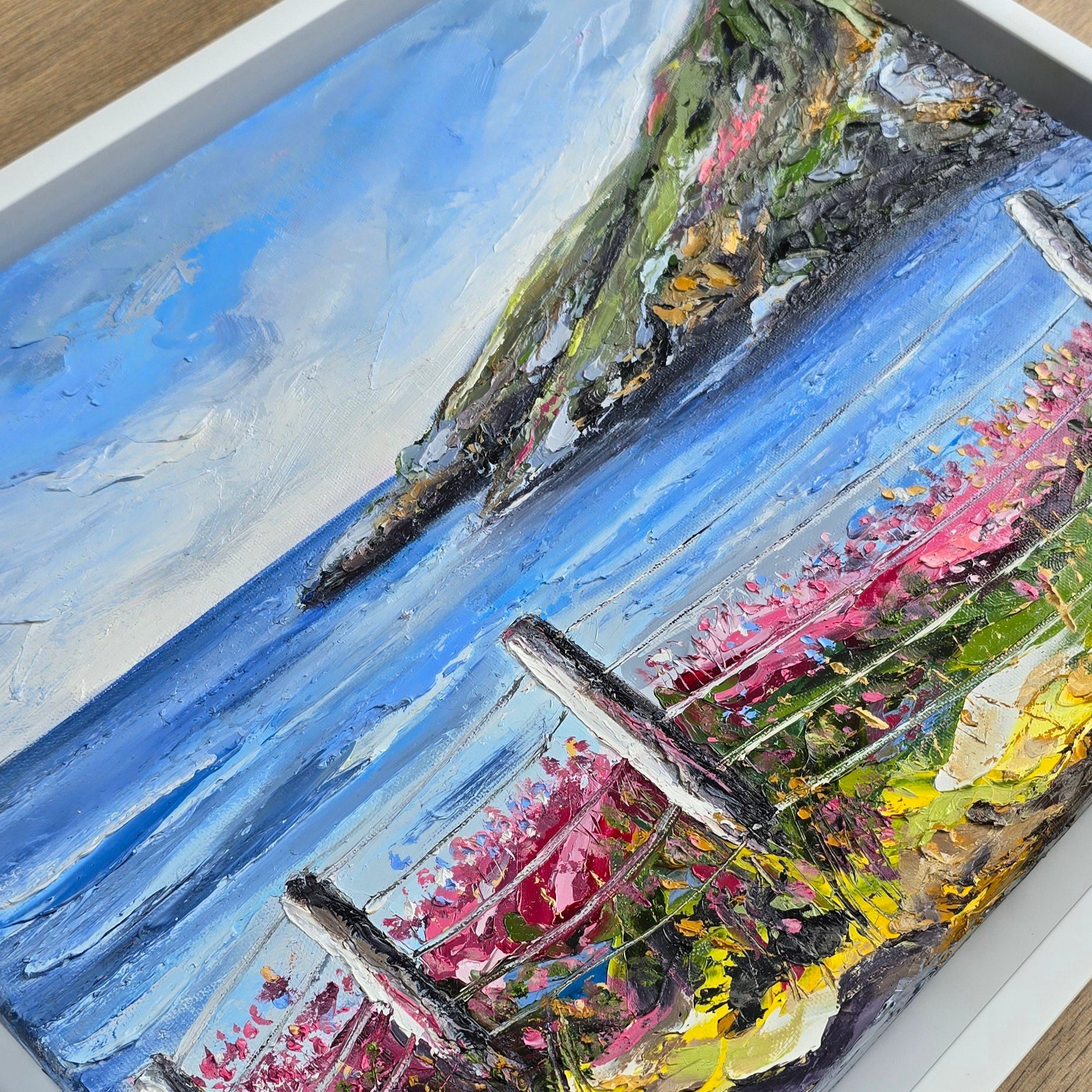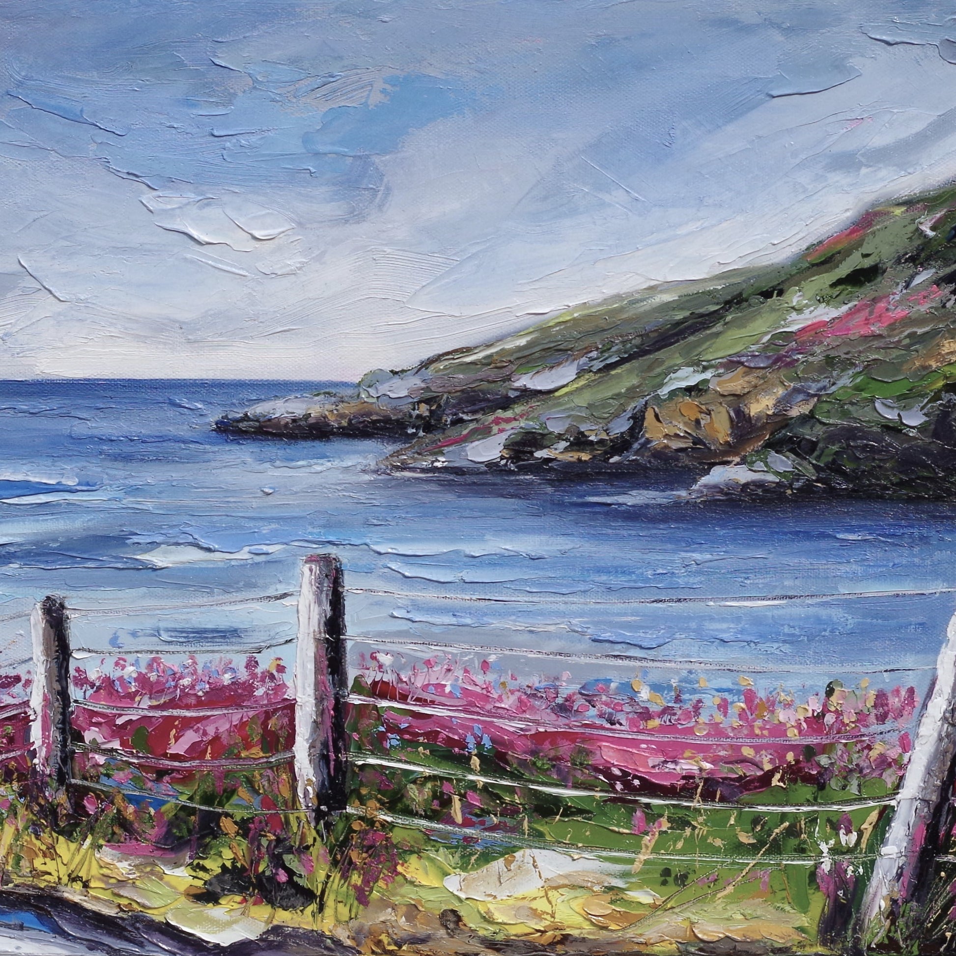 'Slieve League - Co. Donegal' is an original oil painting inspired by one of Ireland’s most beautiful coastal cliffs. Slieve League is depicted through vibrant and expressive colours, capturing the raw beauty and energy of the rugged landscape. Rich colours bring the painting to life, inviting the viewer to feel the fresh sea breeze and listen to the waves crashing far below.