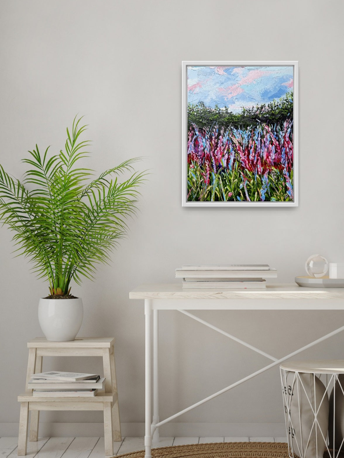 16" x 20" (40cm x 50cm) on a slim canvas, framed.